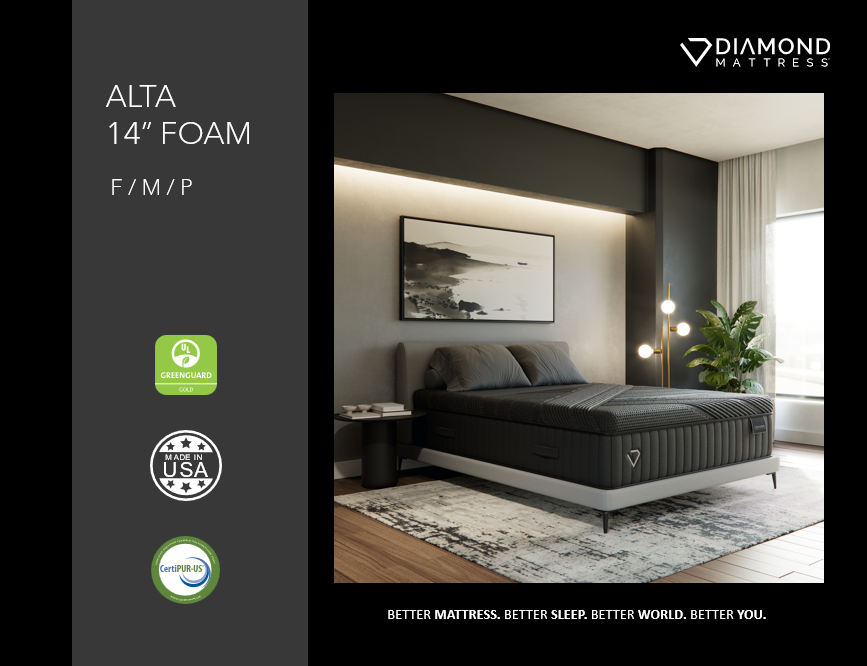 Discover unparalleled comfort with the Alta 14” Foam Mattress, crafted with advanced layers for a truly restorative sleep. Featuring Coolstream Fabric and Ice Flex Cooling Bands, this mattress ensures optimal temperature regulation and a fresh sleeping environment. Its medium firmness provides the perfect balance of support and softness, ideal for all sleep styles. Certified by CertiPUR-US®, the Alta combines luxury with eco-friendly materials to elevate your rest.
