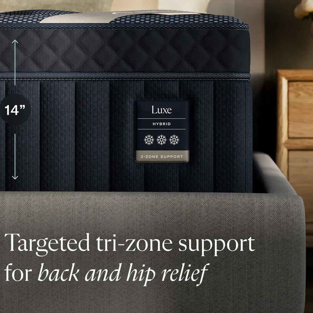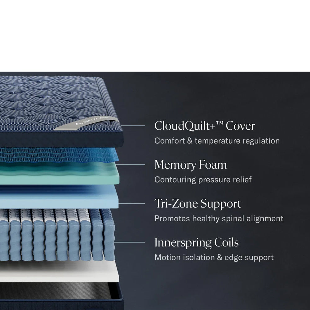 DreamCloud Luxe Hybrid features a 7-layer design with memory foam and cooling fibers quilted into our signature CloudQuilt+™ euro top. Individually wrapped coils provide responsive, breathable support, while extra-cooling phase change material and our innovative tri-zone support system target your back and hips for next-level comfort. Test