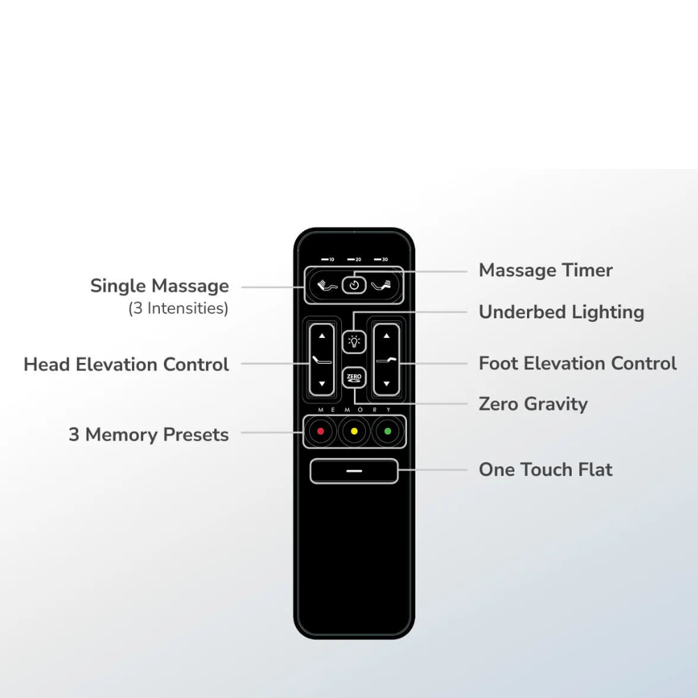 Enjoy remote powered features like head and foot elevation, zero gravity positioning, and dual massage functionality.